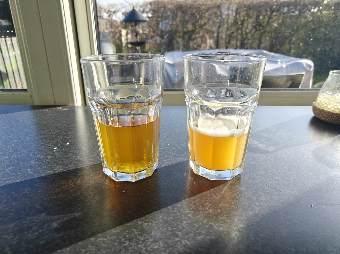Billedet viser 2 glas med den samme øl. Forskellen er at den til venstre er tappet fra oven i tanken, og den til højre er tæt på bunden. Jeg plejer at smide det ud når det bliver uklart som her i pilsernen, men nu har jeg lavet 6 flasker med den uklare - så skal jeg se om der er smagsforskel med eller uden "grumset". Umiddelbart smager den ens lige fra gærtanken, men lad os se når de er modnet.